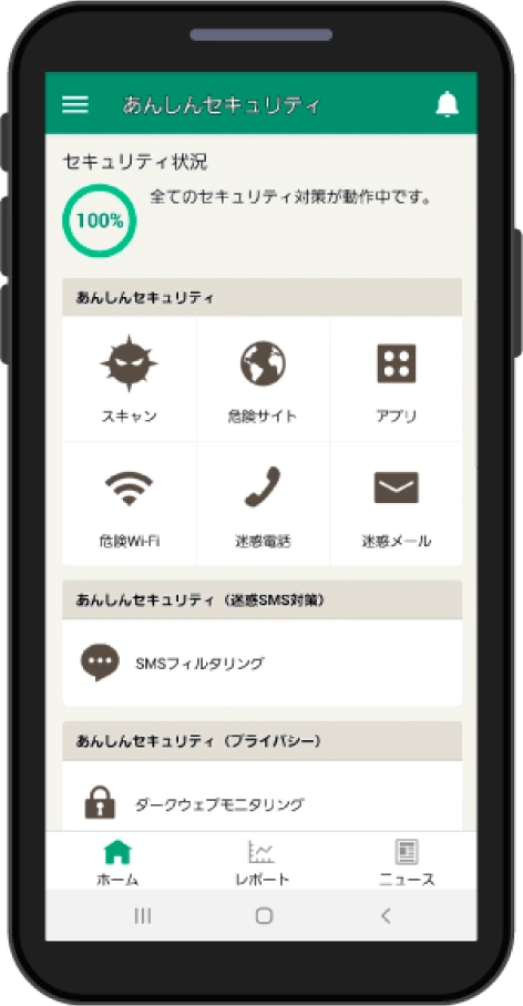 危険サイト・迷惑電話・迷惑SMSなど様々な脅威から、ご自身のスマートフォンをお守りする基本のセキュリティプランです。万が一の時に備えた補償(特典)もついています。